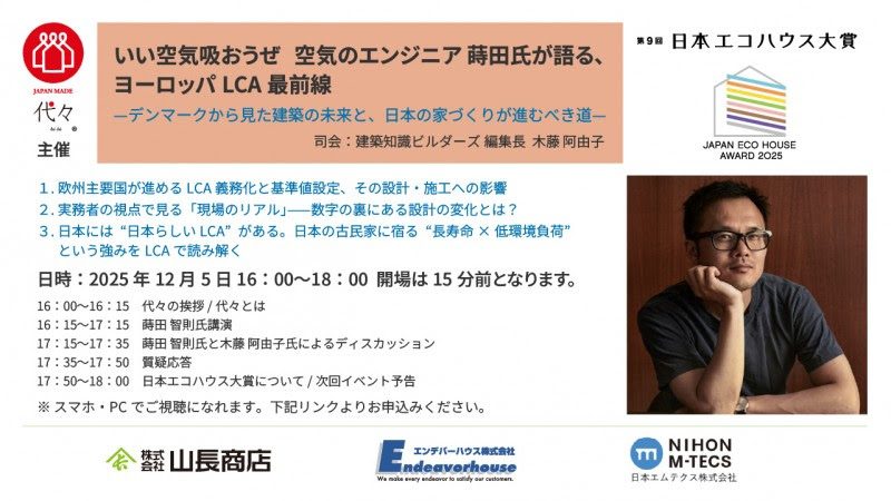 今回の代々の家 主催のウェビナーでは、デンマーク在住の環境設備エンジニア/空気のデザイナーの蒔田智則氏をお迎えします。建築知識ビルダーズの編集長、木藤阿由子さんを司会に【デンマークから見た建築の未来と、日本の家づくりが進むべき道】をテーマに、ヨーロッパのLCA最前線と日本らしいLCA、これからの日本の家づくり街づくりについてお話いただきます。